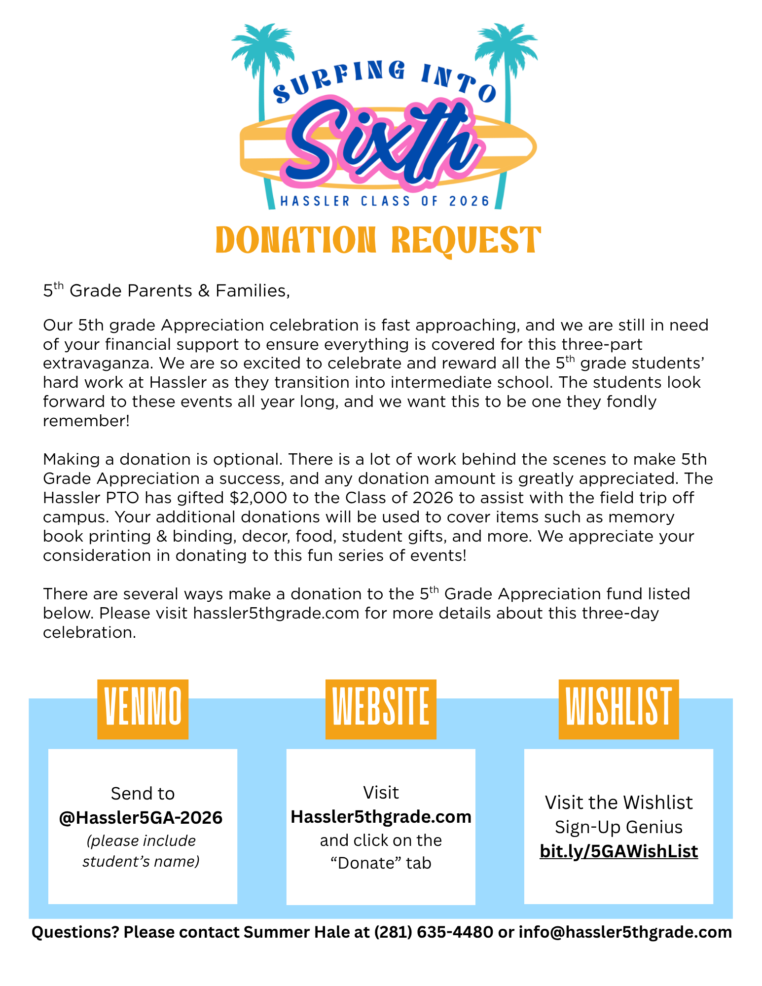 Your donation will go towards funding the three-day celebration for the Hassler Class of 2026. This includes catered food, sno cone trucks, decorations, student personalized gifts, memory book printing and binding, and so much more!